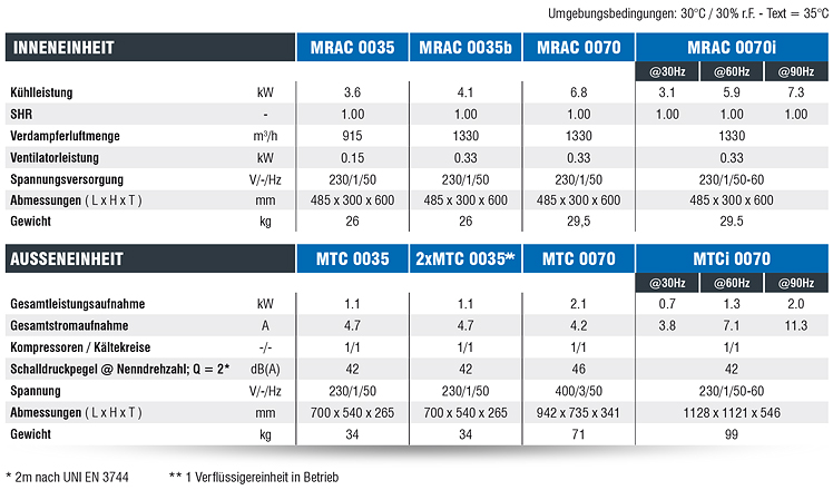 MARC ist die richtige Wahl um 19"-Racks zu kühlen, die eine genaue Temperaturregelung und einen 24h Betrieb gewährleisten müssen. Es gibt sie in Split-Ausführung mit luftgekühltem Außen-Verflüssiger mit Kältemittel R410A, von 3,6 bis 7,3 kW.